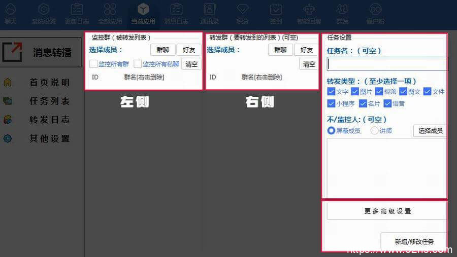 左侧是我们的监控群(主讲群),点击【群聊】。选择主讲群(素材群,监控群)比如说我们选择1群作为主讲群,右侧选择转发的目标群,点击【群聊】,选择多个群,比如我们选择2-5群。最后我们做任务的细节设置。任务名可以留空不设置。转发的类型一般是全选。