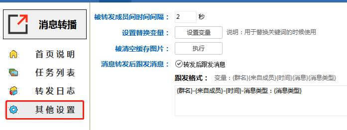 点击左侧的【其他设置】。我们可以设置每条消息发送的间隔,默认是2秒,也可以执行清空缓存,因为我们发送的消息有图片视频,这些都会有本地的缓存垃圾,我可以点击执行清空缓存垃圾。