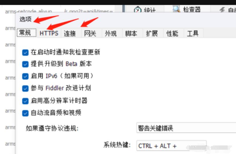 首先是配置fidder,打开fidder工具后,点击工具栏选项,将前三个里面的内容全部勾选: