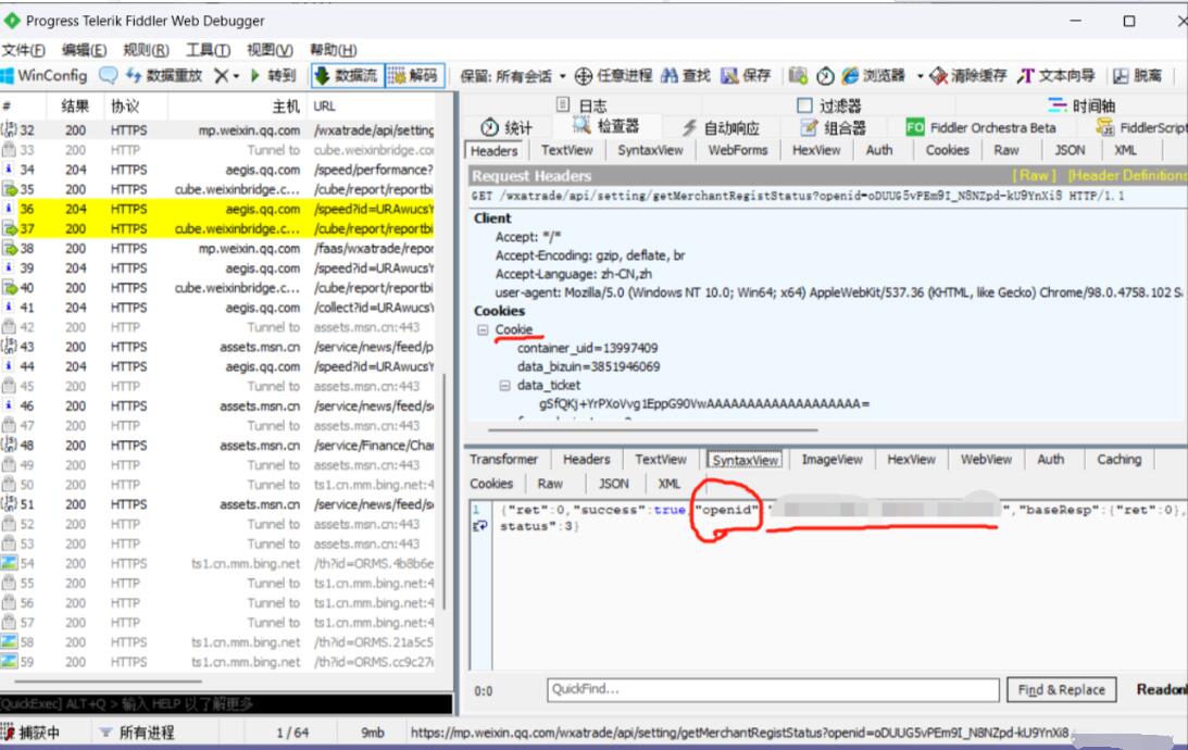 然后打开小程序,获取小程序的数据流进行解码,找到相关的数据,获取openid跟cookie