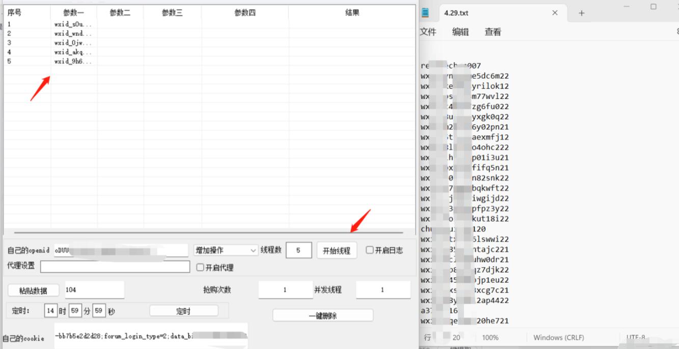 到了这部操作就可以实现wxid转换了,然后将wxid复制到软件上点击开始线程。
