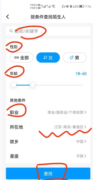 3、 通过QQ输入关键词-按条件查找陌生人-支持-性别-年龄-职业-所在地区-然后获取QQ号-导入系统添加好友